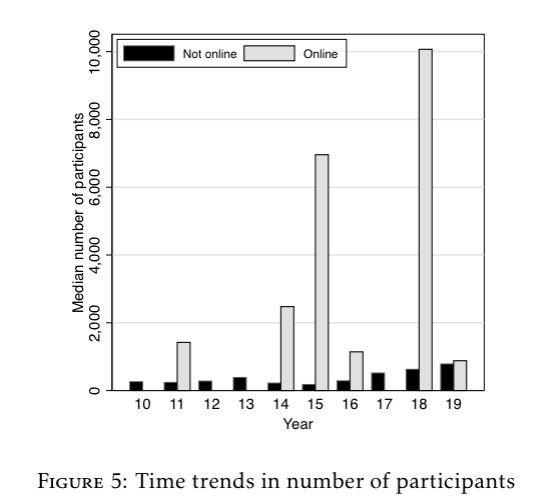 Only around 5% of experiments reported in the top 5 journals between 2010 and 2014 included an online treatment. However, that percentage rose to 23% between 2015 and 2019 (Fréchette et Al., 2022).